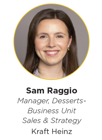Sam leads sales strategy for the total desserts business at Kraft Heinz, managing brands across dry, refrigerated, and frozen temperature state. She leverages her retail experience from Meijer, where she spent 5 years in various buying and planning roles, to drive strategies and solutions across the desserts business at Kraft Heinz since she joined the company in 2023. She is a graduate of the University of Michigan, with a degree in Economics and Political Science. She currently lives in Chicago with her husband, Joe.